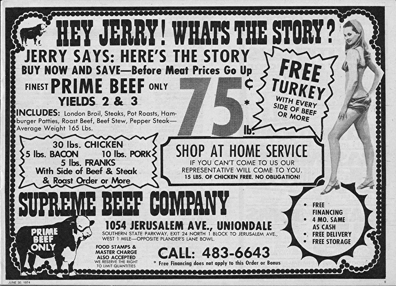 I love this meat company ad, which strangely references the JGE Appliances television commercials of the day which asked "Hey, Jerry! What's the story?" Throw in some equally puzzling cheesecake and you've got a classic, unearthed at last for the Internet Age!